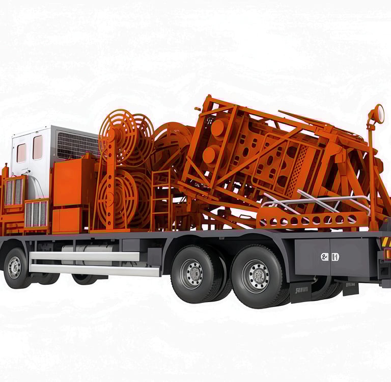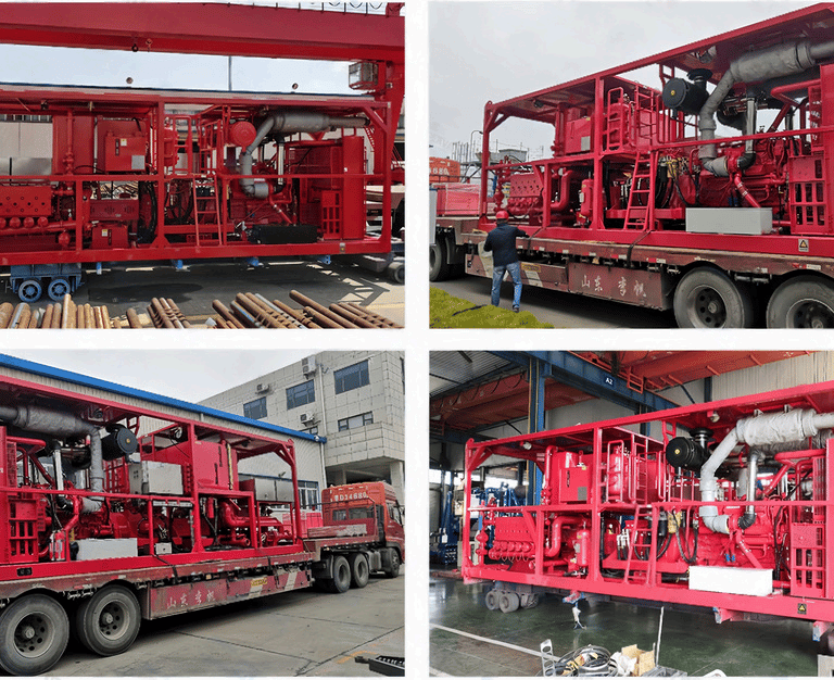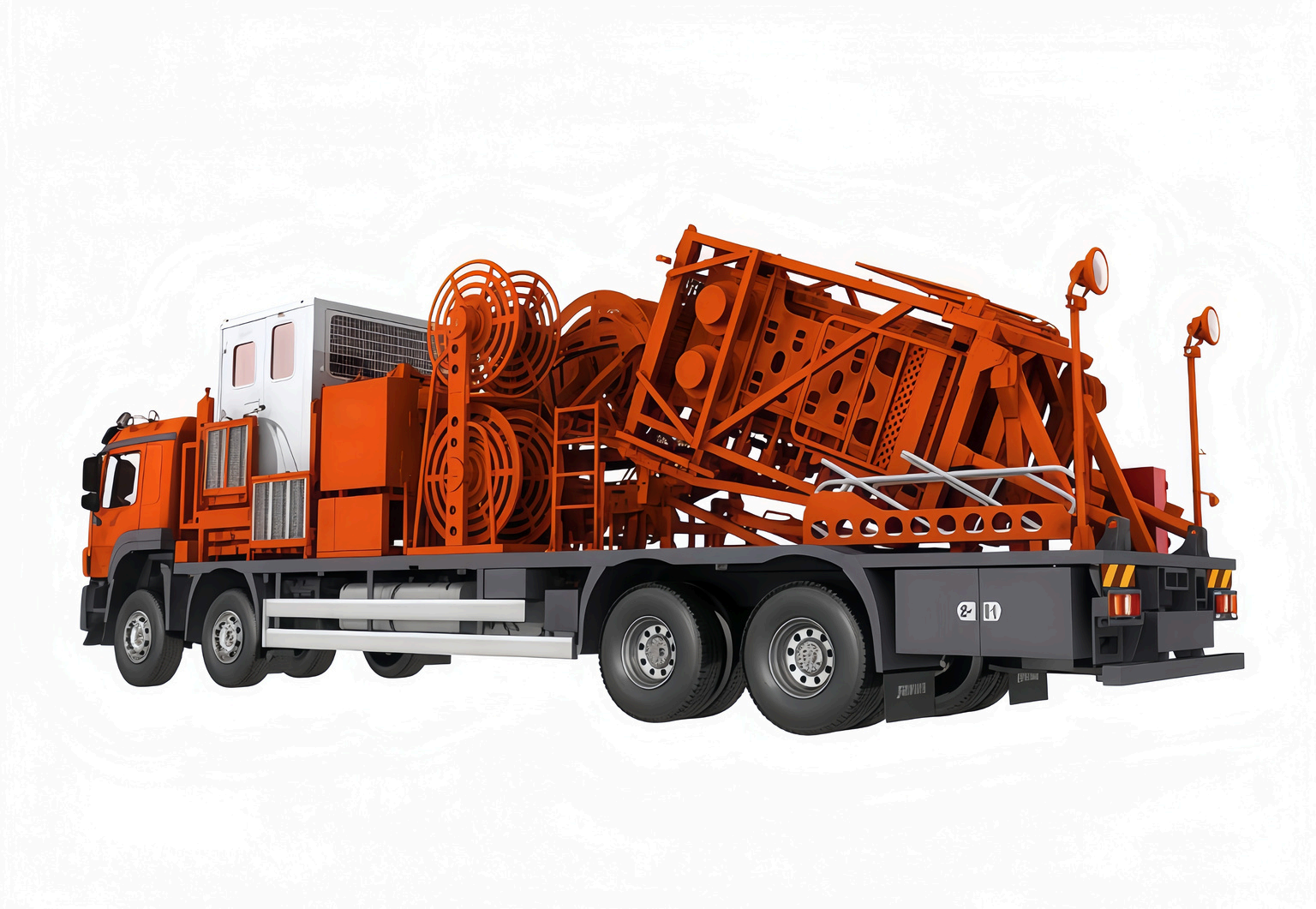 The power, transmission, control, and hoisting systems of the truck-mounted drilling rig's main unit, as well as the crown block and derrick, are centrally installed on a dedicated trailer, enabling easy installation and rapid transportation. It adopts a telescopic mast derrick and a foldable substructure. Equipped with one or two power units, it can achieve single-unit or parallel operation of the power units through a multi-speed gearbox and a gear transmission case.